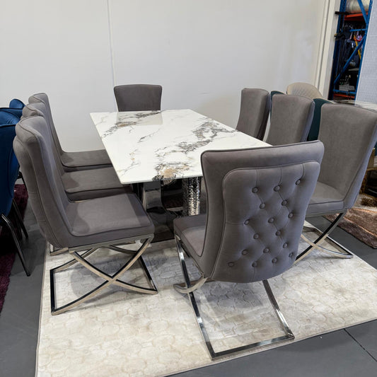 Sierra Faux Marble Dining Table + 8 Chairs Set - Silver
